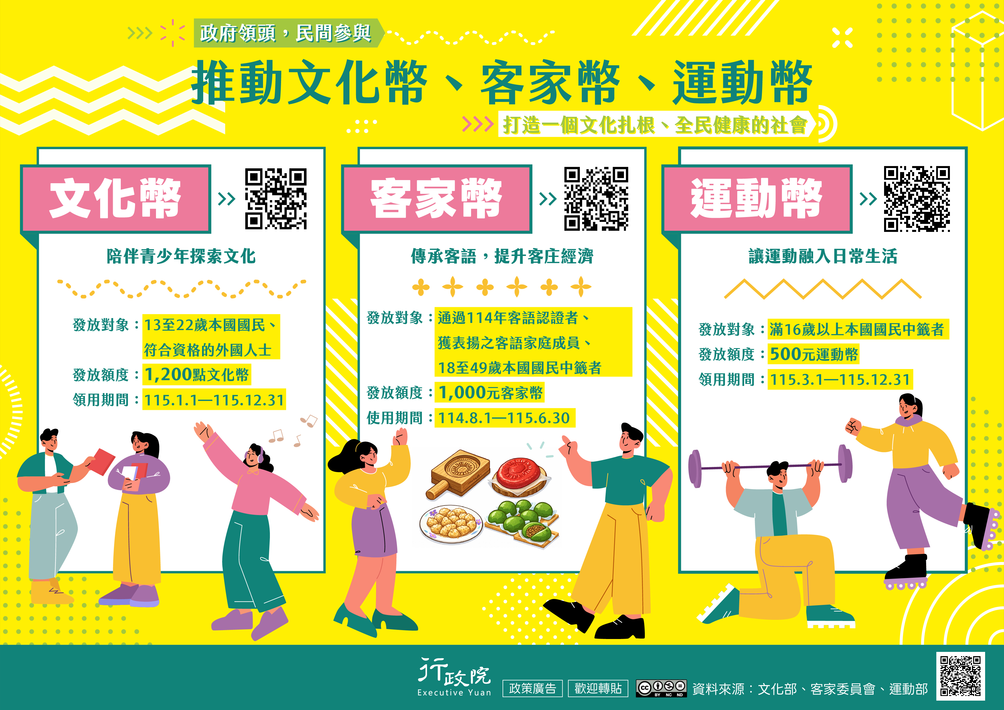 為鼓勵青少年踴躍參與藝文、運動等休閒活動,並促進相關產業發展,文化部發行文化幣,發放對象為13至22歲本國國民及符合資格的外國人士,額度為1,200點,領用期間為115年1月1日至115年12月31日;客委會推動客家幣,發放對象為通過114年客語認證者、獲表揚之客語家庭成員及18至49歲本國國民中籤者,額度為1,000元,使用期間為114年8月1日至115年6月30日;運動部發行運動幣,發放對象為滿16歲以上本國國民中籤者,