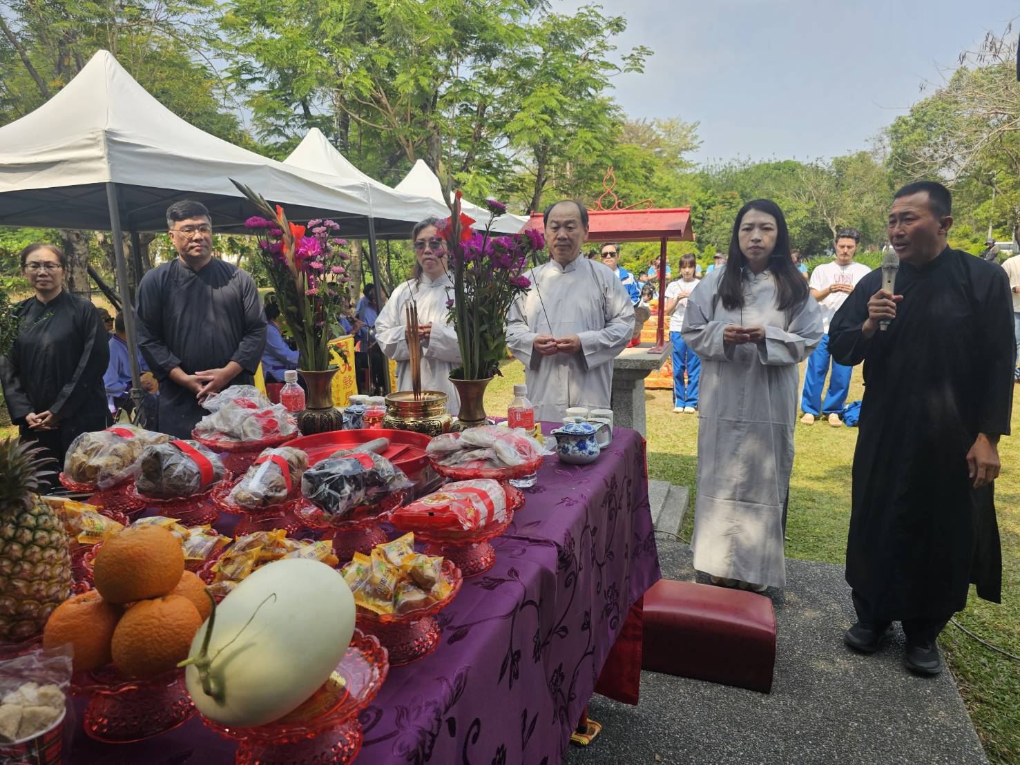 3月20日伯公生當天,中心於開基伯公區舉行遵循客家禮俗的三獻古禮祭儀,並邀請「大夥房藝術團」現場演奏傳統客家八音古樂(打八音),展現莊重而溫馨的祭祀氛圍。同時有近百名幼兒園的小朋友參與盤花教學體驗,在老師指導下將花卉一層一層堆疊成盤花,再將親手完成的盤花敬獻伯公,讓孩子在實際參與中認識並感受客庄代代相傳的文化禮俗。