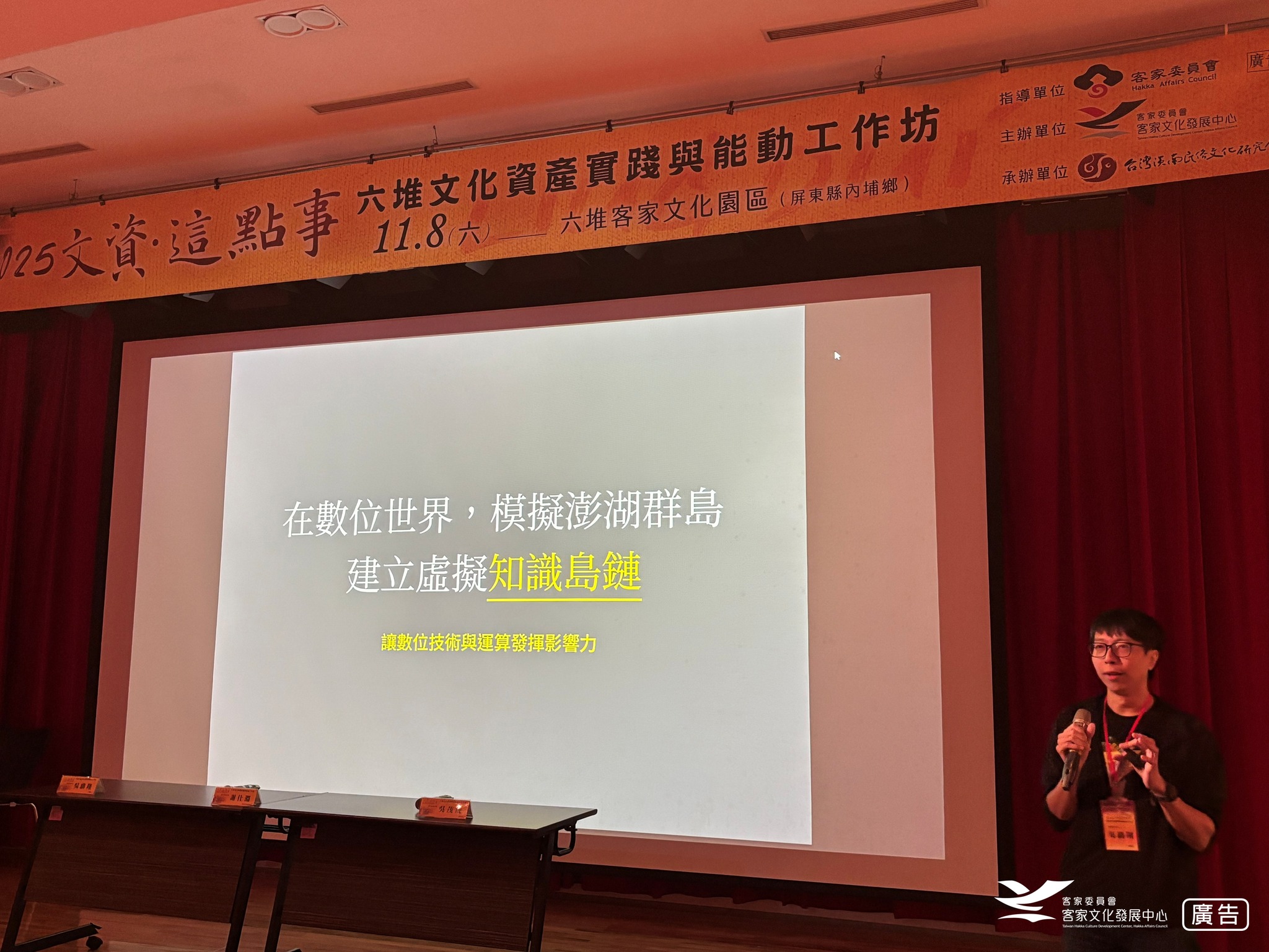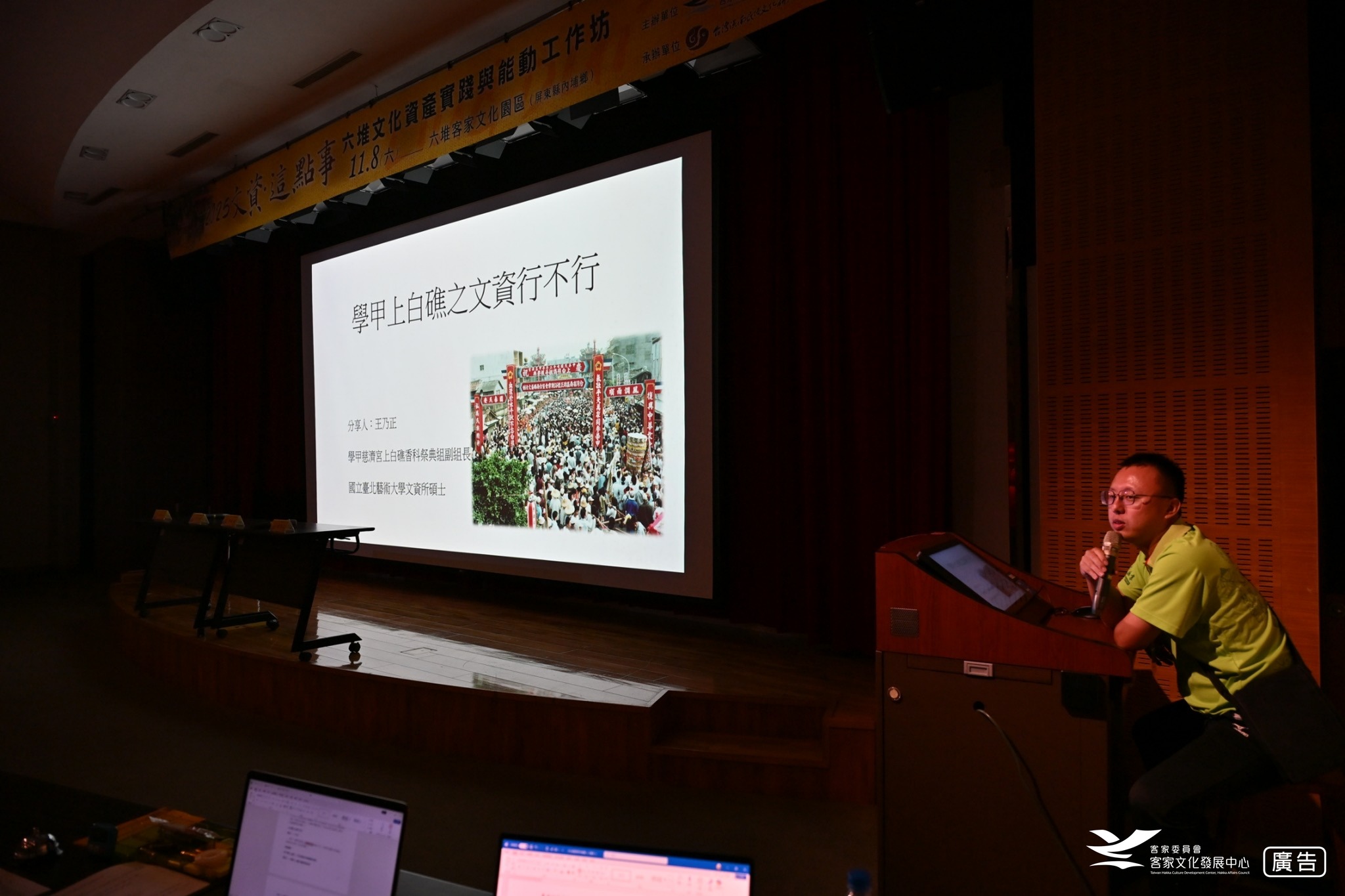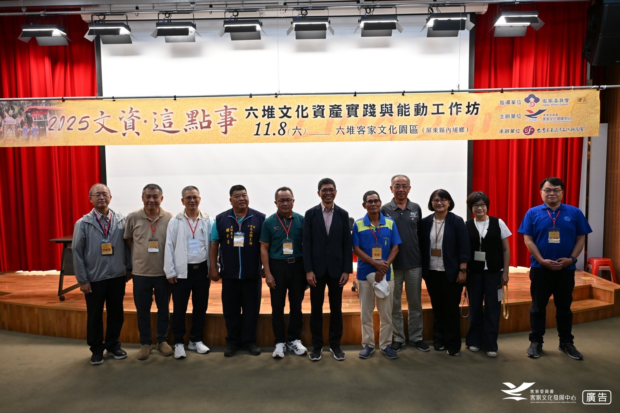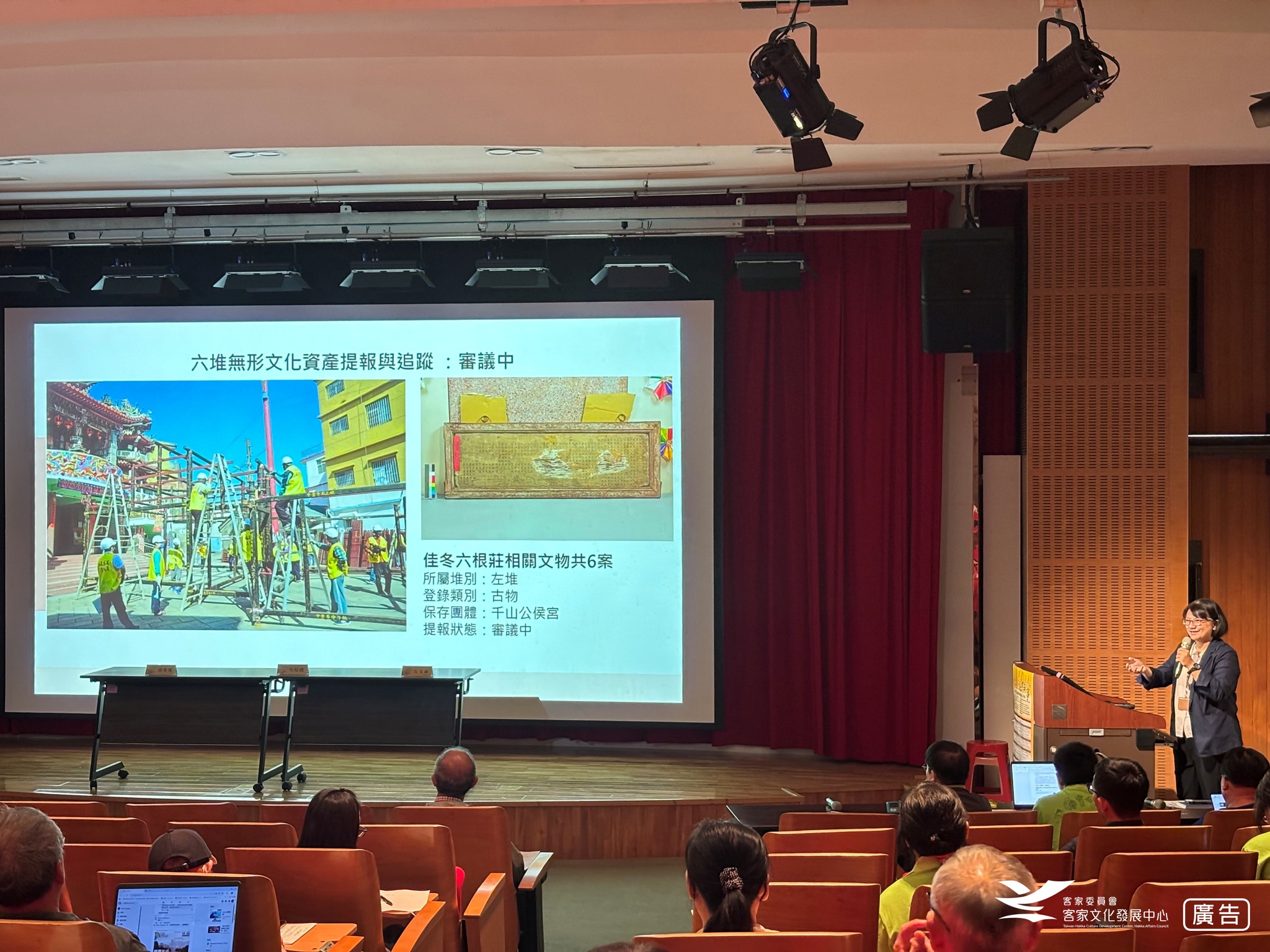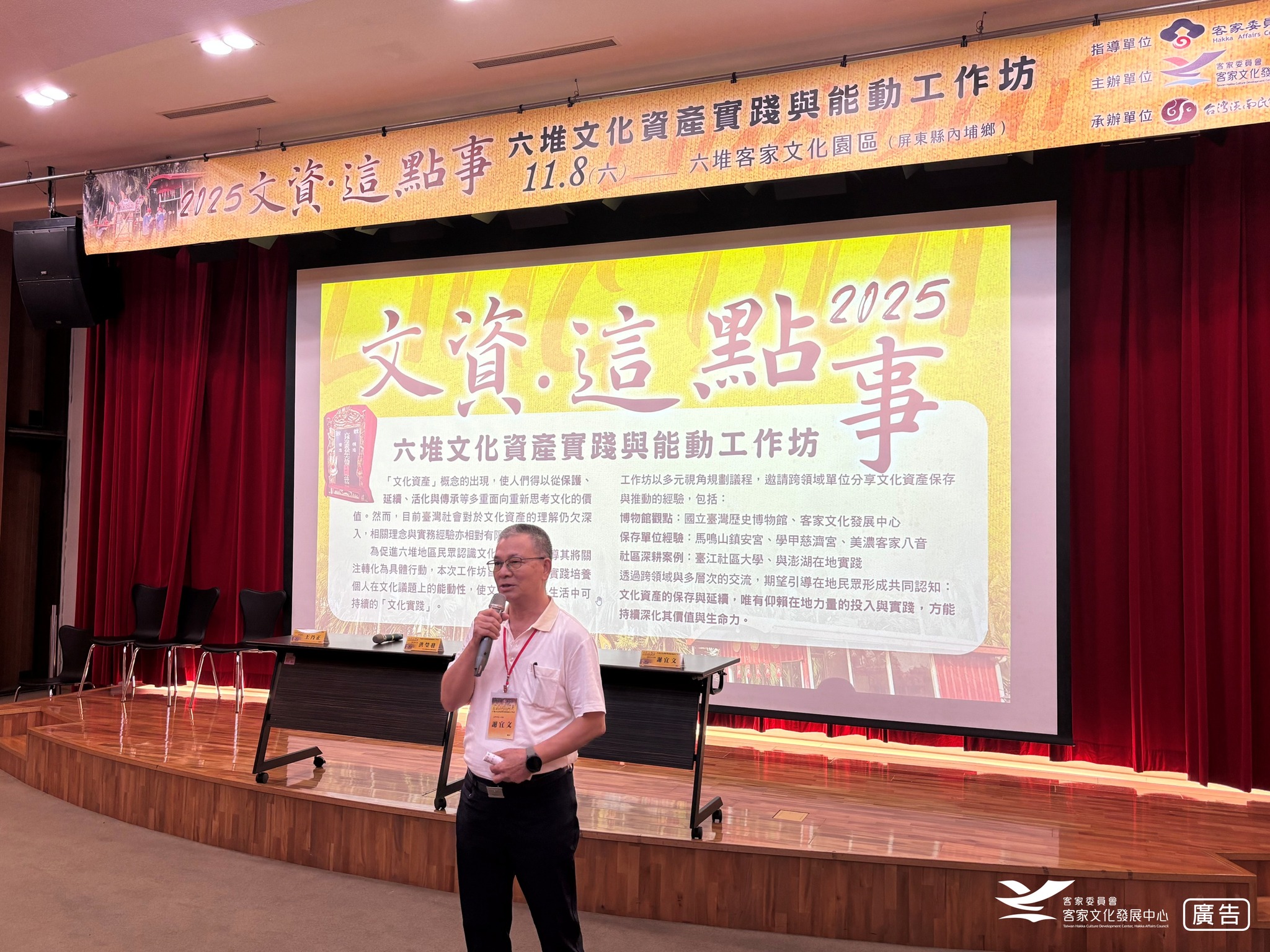 客委會客發中心今(8)在六堆客家文化園區舉辦「文資˙這點事:2025六堆文化資產實踐與能動工作坊」,本次特別規劃三個場次,由 不同面向的文資推動與實踐者進行經驗分享, 第一場「典藏再現:博物館角色」,由國立臺灣歷史博物館及本中心分享現行博物館推動文化資產的案例。 第二場「在地實踐:民眾參與」,邀請臺江社區大學及澎湖知識服務平臺,分享在地實踐及參與的經驗。 第三場「文資推手:保存者」,以美濃的客家八音、雲林馬鳴山鎮安宮及臺南學甲慈濟宮等保存及推廣經驗進行分享。最後「共下來討論:有話就說」 以無形文化資產–「佳冬六根莊作福拜新丁新枝」為案例,對於保存的推動及困境,共同進行討論及建議。