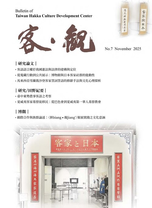 發布日期:出刊日期:202111並列刊名:Bulletin of Taiwan Hakka culture development center刊期:半年刊ISSN:2789-4924出版單位:客家委員會客家文化發展中心出刊地:臺灣出刊語言:中文繁體 資料庫授權 國家圖書館 期刊文獻資訊網HyRead 台灣全文資料庫華藝線上圖書館 項次 篇名 作者 頁次 瀏覽 1 客家觀點。觀點客家 何金樑 002-003 2 主編的話 賴郁晴 006-007 3 臺灣客家宗教的過去與現在——重返日本人類學家的田野地 河合洋尚、橫田浩一、奈良雅史 008-021 4 重訪田野的意義與實踐:從《臺灣兩個閩客村落的親屬與社區》一書談起 黃宣衛、林彥岑 022-034 5 評巴博德(Burton Pasternak)《臺灣兩個閩客村落的親屬與社區:新附作者訪談及田野地現況》和一些研究反思 陳東昇 035-045 6 紀錄一個博物館的國際合作交流經驗——臺灣與日本客家的重返田野現場 何金樑、徐國峰 046-051 7 盤花與桐花:客家的傳統與未來 朱玲瑤、馮建彰 052-055 8 微觀到宏觀:從客英大字典到客家與巴色會相遇談起 賴郁晴、梁惠珠、劉莉萱 056-063 9 介接多元對話平台:從客家祭儀的田野紀實到性平深耕獎 戴正倫、賴郁晴 064-069 10 國家歷史的基石:村史的在地書寫 張翰璧、張維安 070-079 11 文化進程中的傳遞與延續——淺談客庄文化資源普查 曾純純 080-085 12 賴熊飛與「賴熊飛大刀」——從嘉慶八年「重修府學文廟粵籍捐題碑記」碑聊起 李博揚 086-095 13 地圖會說話?淺談文化地圖應用於生態博物館——以六堆為例 邱秀英、洪瑩發 096-101 14 從客家研究到展示內涵——以臺灣客家文化館常設展為例 朱玲瑤 102-111 15 行尞.靚靚六堆——以六堆客家文化園區常設展為例 邱鵬瑞 112-119 16 「川流不息——臺灣客家與日本國際展」展前研究紀實 洪登欽、賴般若 120-126 17 六堆認同:以大武山下走相逐—六堆運動會特展為例 李萍、徐芳智 127-131 18 文本裡的客家 黃芃瑋 132-135 19 從六堆300紀念大會論族群共榮意義 王彥智 136-138 20 漫談「大獅兄家族人偶劇團」 吳紜忻 139-145 21 從體驗去連結在地客家——以輕旅行及客庄串連活動為例 邱顯鈞 146-149 22 以對土地及人文的情感來讓環境教育更多元 曾翰文、戴士超 150-155 23 好書推介 156-157 24 當期展覽 158-159